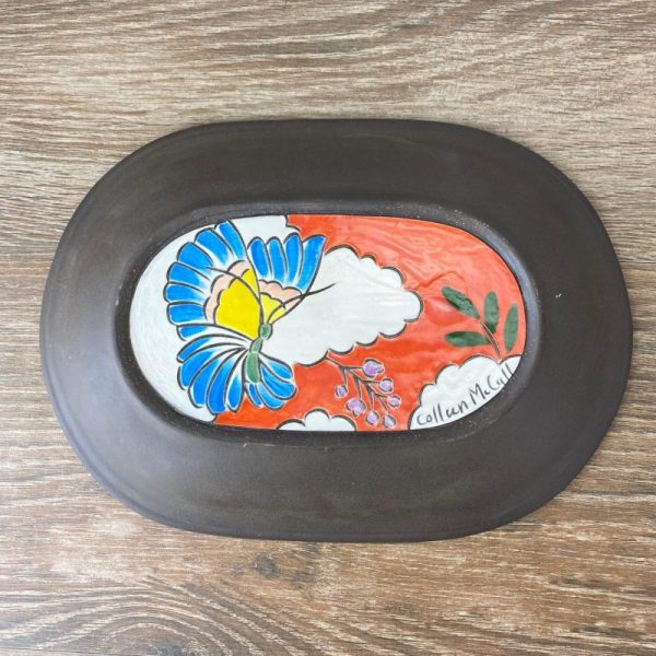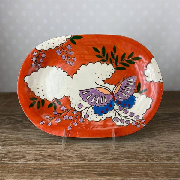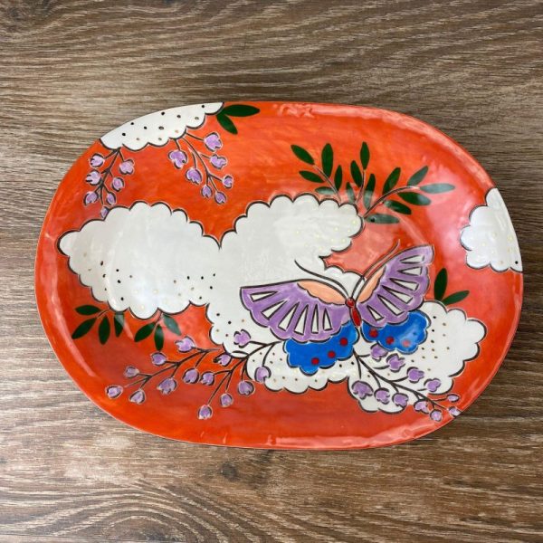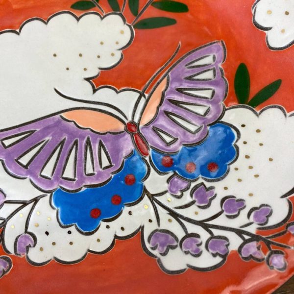 Our most versatile plate shape can be used as both a dinner plate and a small serving platter, just not at the same time! Painted by hand in a variety of colorful modern vintage designs that are fun to mix and match. This butterfly plate in vibrant red orange and white is embellished with glittery gold luster dots. More is more! Beautiful displayed when not in use.