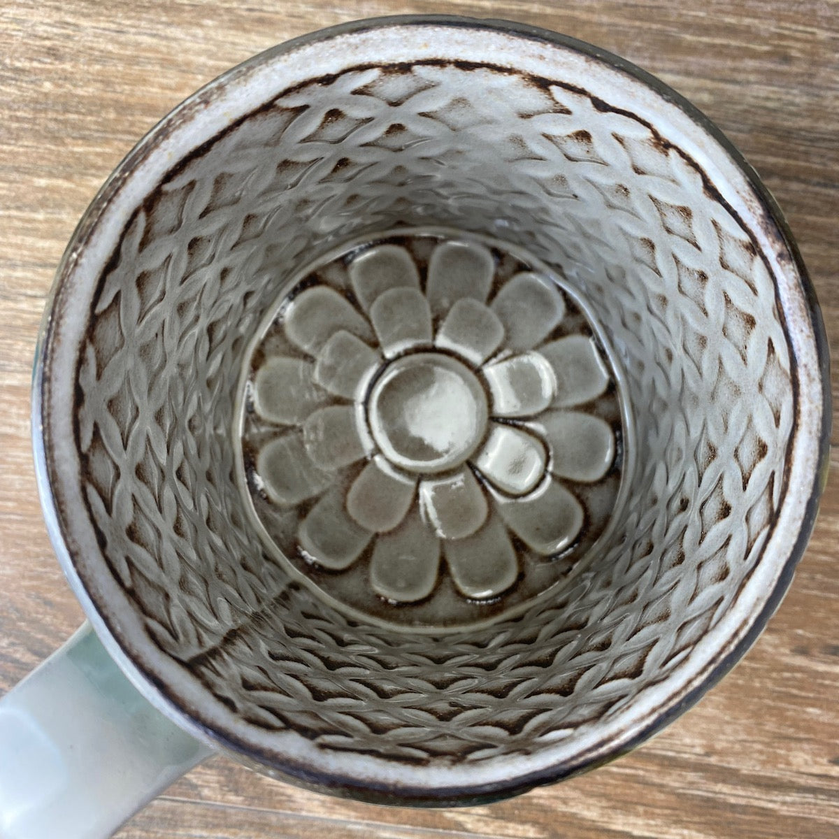 Decorated inside and out, this colorful mug is pure joy. Painted with a variety of flowers in all the colors on a rich teal background. The pattern wraps around the surface for right or left handed mug lovers. Handle offers an ample grip. The perfect pick me up for your caffeine indulgence.