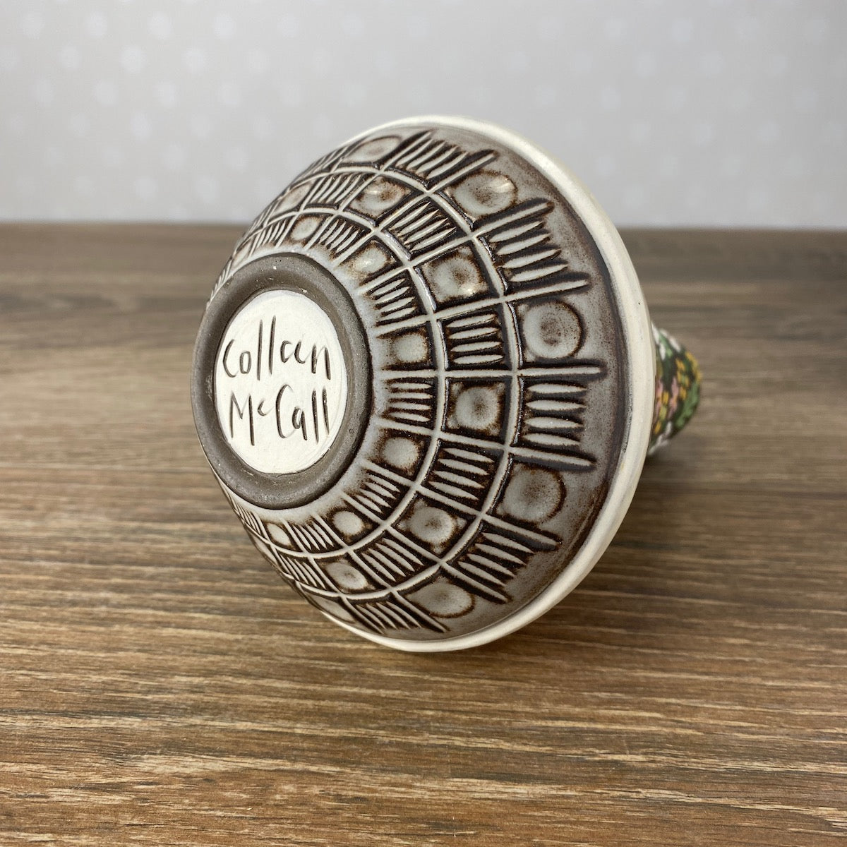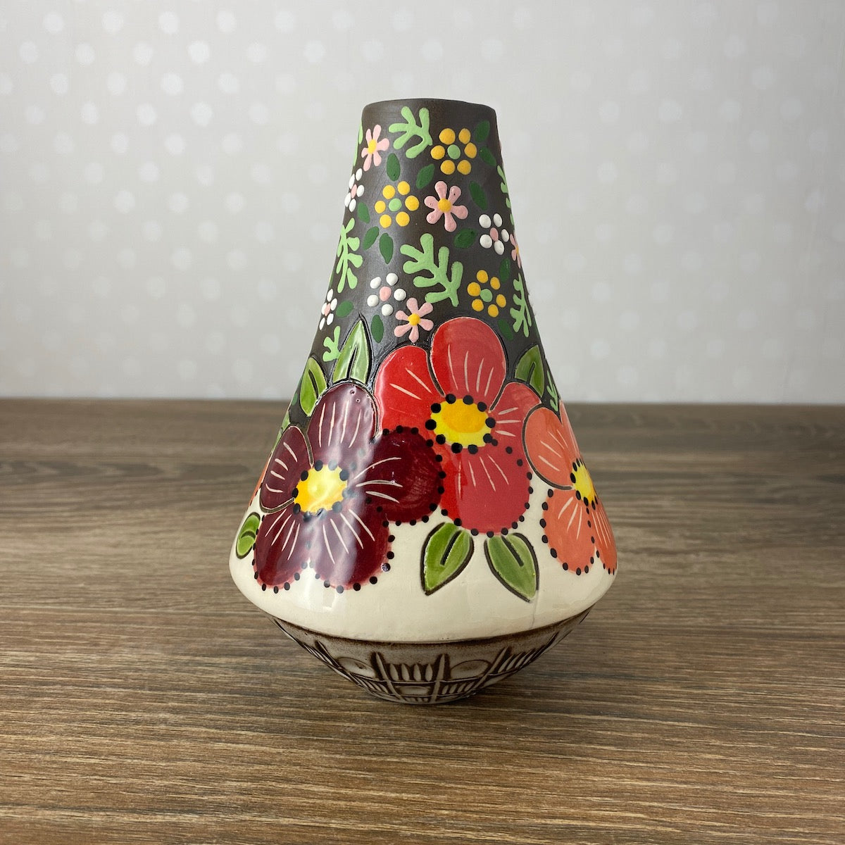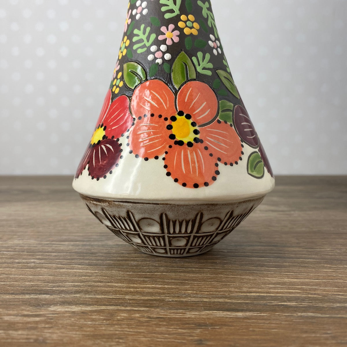 This charming funnel vase features bold hand painted florals that wrap around its form. Each bloom is accentuated with sgraffito, where details are carved into the clay surface, creating wonderful texture and depth. The resulting blossoms look like a quilt applique. The petite calico on the upper neck of the vase is decorated directly on the dark brown clay surface. We like the contrast of having both the matte and gloss surfaces. Perfect for displaying a cheerful bouquet or standing solo as a sculptural accent, this piece artfully crafted with a touch of whimsy.
