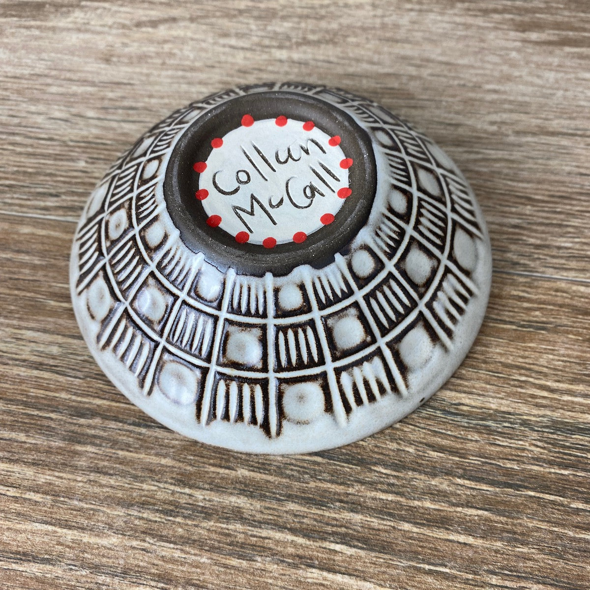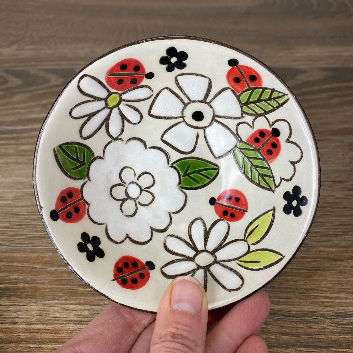 Cute and convenient size for use as a food safe bowl, pill dish or jewelry holder. The curved interior is hand painted with assorted designs such as fruit, flowers, insects and animals. Press molded from a vintage glass dish to capture its shape and handsome texture. The exterior texture is a joy to hold and feel. It's further accentuated by a subtle tin white glaze.