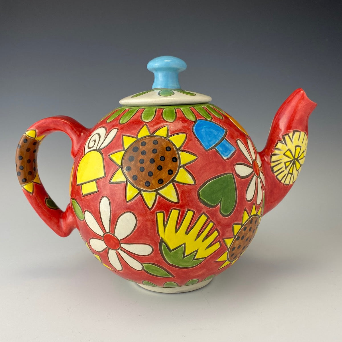 This charming red hand painted tea pot is made of durable stoneware and decorated with a variety of stylized flowers, mushrooms and snails. The lid has the cutest mushroom knob too!
