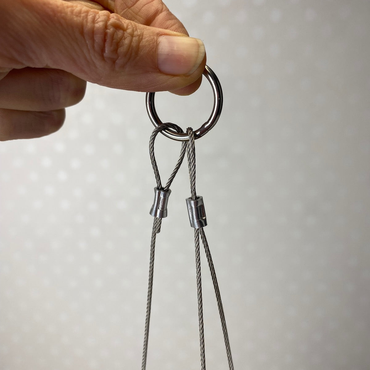 The rim is reinforced with an extra coil of clay that is gently thumb pressed in scallops on the interior. The final piece is strung with stainless steel cable and welded ring. See detail image.