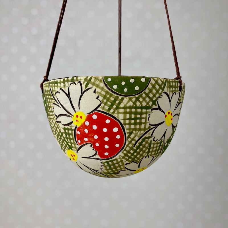 Add a colorful pop of whimsy to your home, garden or office with the small hanging planter. Available in a variety of modern vintage designs including fruit, flowers, daisies, butterflies lady bugs and more. Each piece is uniquely hand painted by the artist herself and ready to ship.