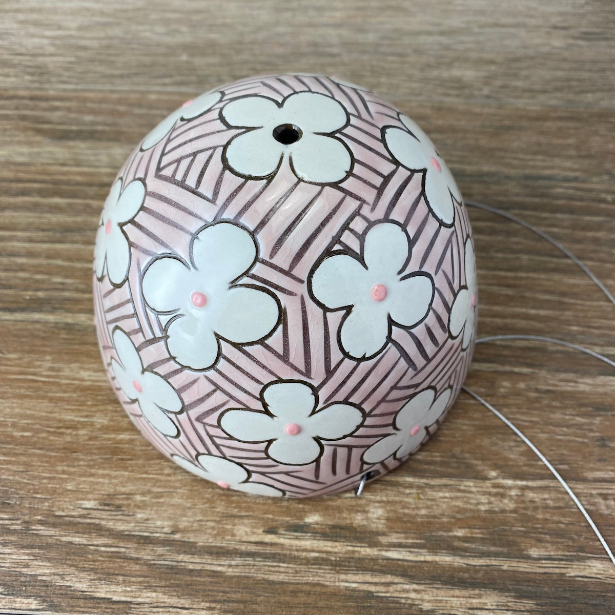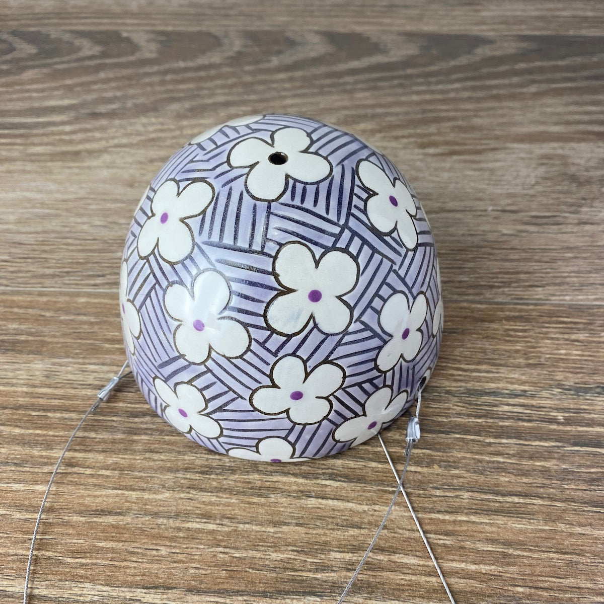 Each piece is slip cast for uniformity of shape and size. The rim is reinforced with an extra coil of clay that is gently thumb pressed on the interior edge. The final piece is strung with stainless steel cable and welded ring. See detail image.