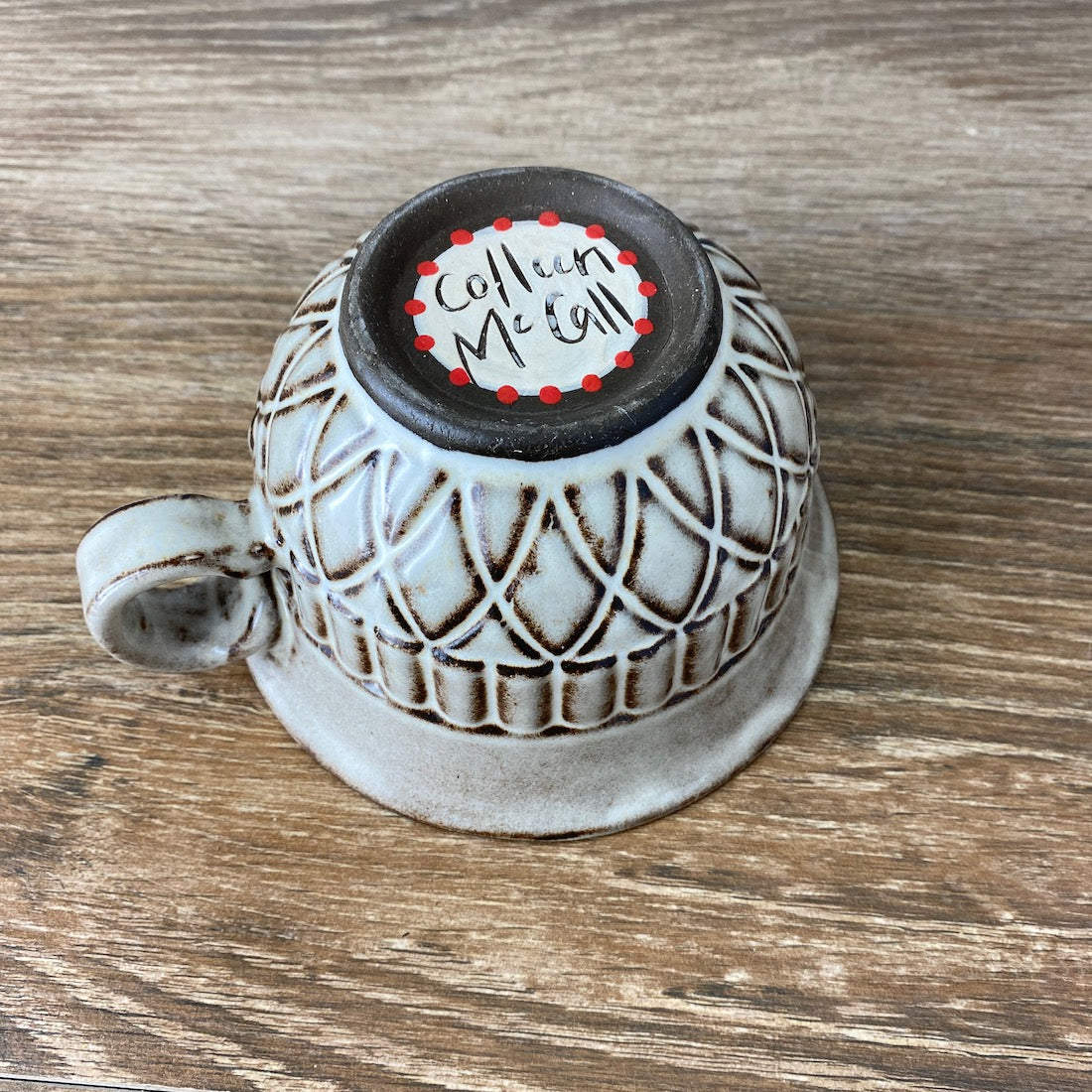 The unique shape and texture of this dish comes from vintage pressed glass. The shape is adapted to hold 16 ounces (a full can of soup). Our dark brown clay is carefully pressed into the plaster mold and the bowl interior is made nice and smooth. It is then coated with porcelain slip to create a blank canvas for decorating with vibrant underglazes. The line work is the result of carving through the decorative layers to the dark brown clay beneath. A technique known as sgraffito. This particular motif is further decorated after the first firing to add more glaze colors prior to being brushed in clear glaze. The exterior gets a dip in our signature tin white glaze to highlight the surface texture.