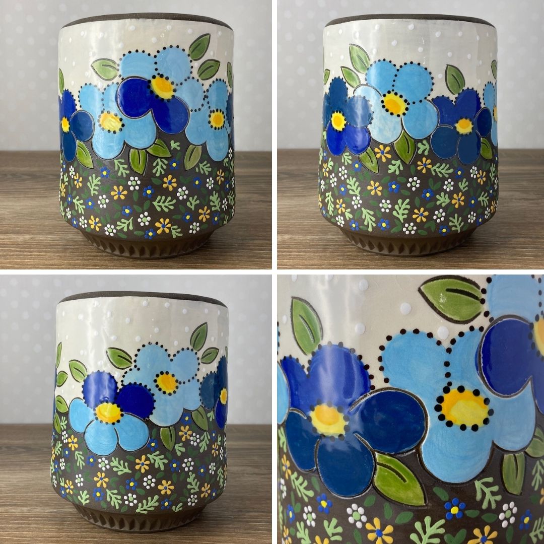 Our newest offering, the utensil crock, will spruce up any kitchen counter AND keep your favorite utensils handy. Made from sturdy stoneware and hand painted by the artist herself. Each container is decorated in the round in a pleasing array of modern vintage florals. Choose your pattern from the menu and the corresponding image will appear. If an item is pictured but not listed in the menu, it has already found a home.